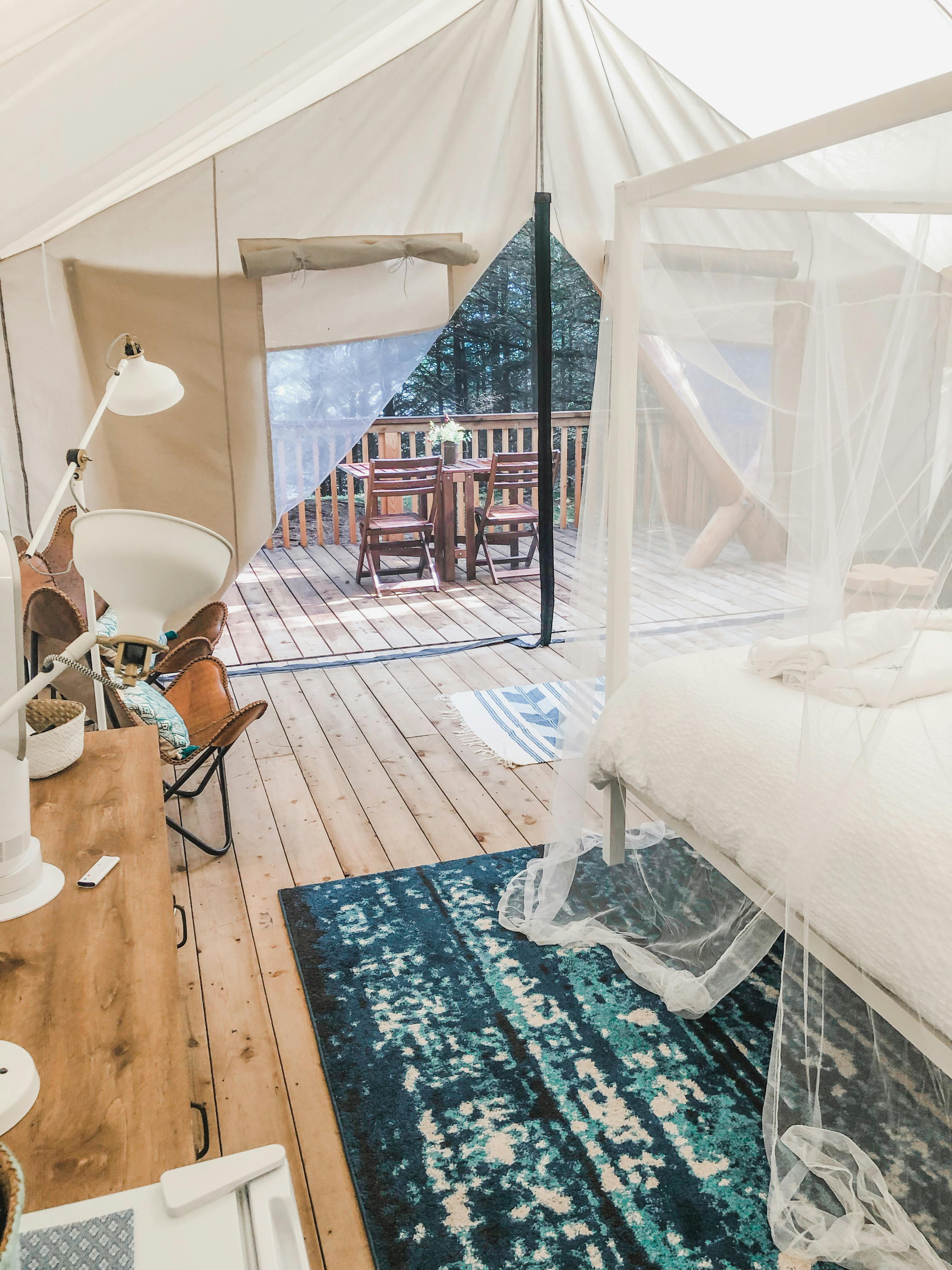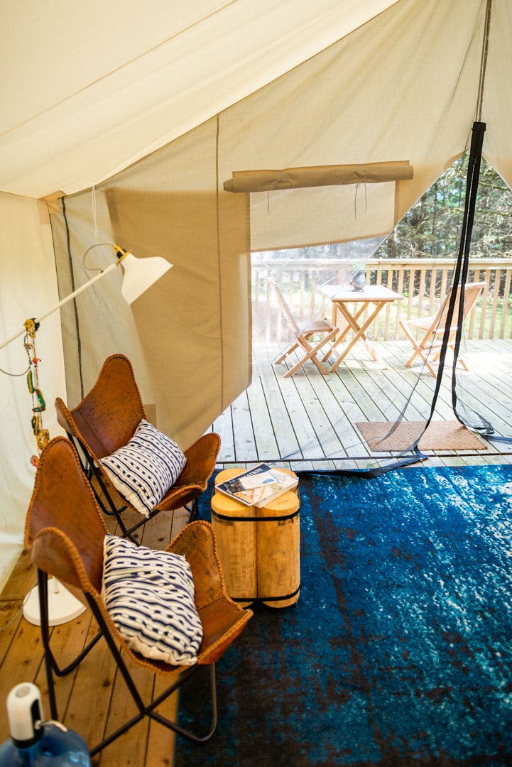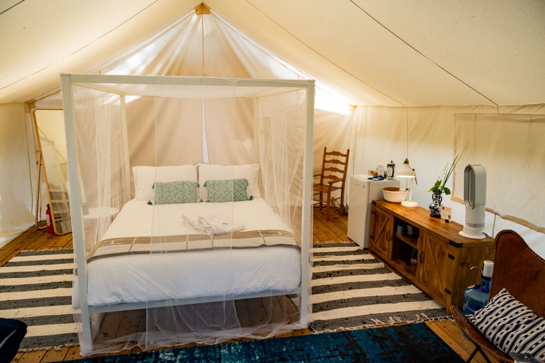 This suite is equipped with a private ensuite bathroom inside your tent which includes a shower, sink, and flushing toilet. A Dyson heat/cool fan will keep you warm at night or cool during the day.