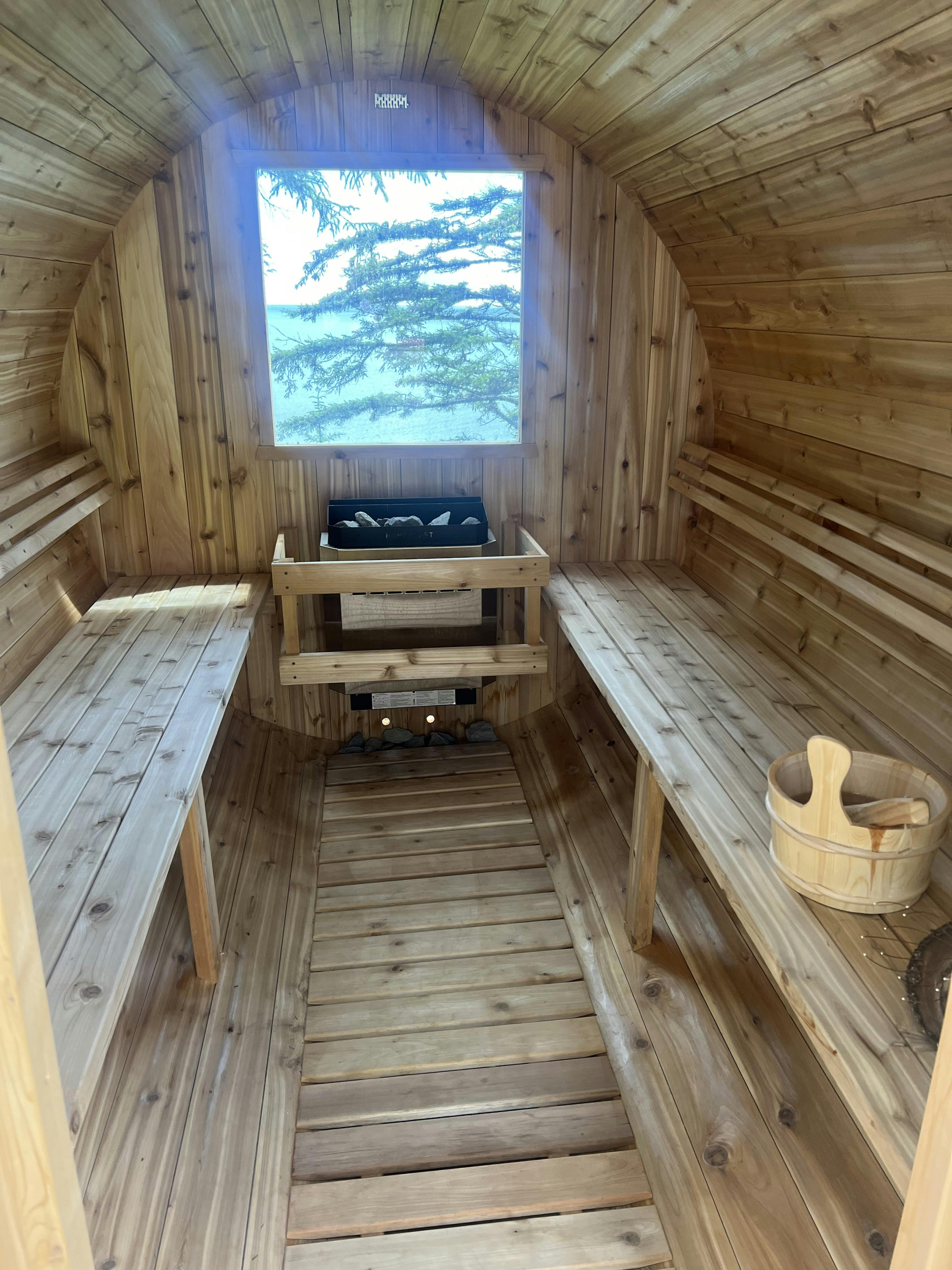 - Nootka Cedar Barrel Sauna 10ft: Heats up in around 30 minutes (electric), can be used wet or dry and comes with organic essential oils that can be sprayed directly on the coals for an aromatic experience.