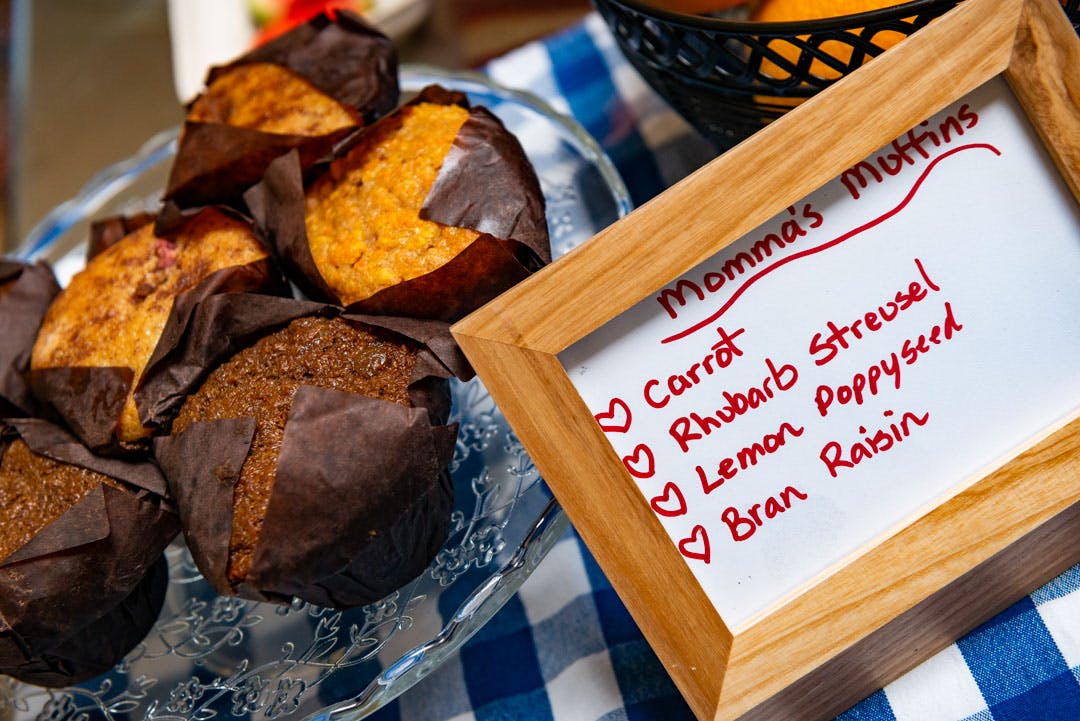 Includes a selection of homemade muffins, cereal bar, toast bar, yogurt, a selection of fresh and frozen fruit. Dairy and non dairy milk choices available. A selection of condiments. Juice, coffee and tea. And mini smoothie station with a selection of protein powders.